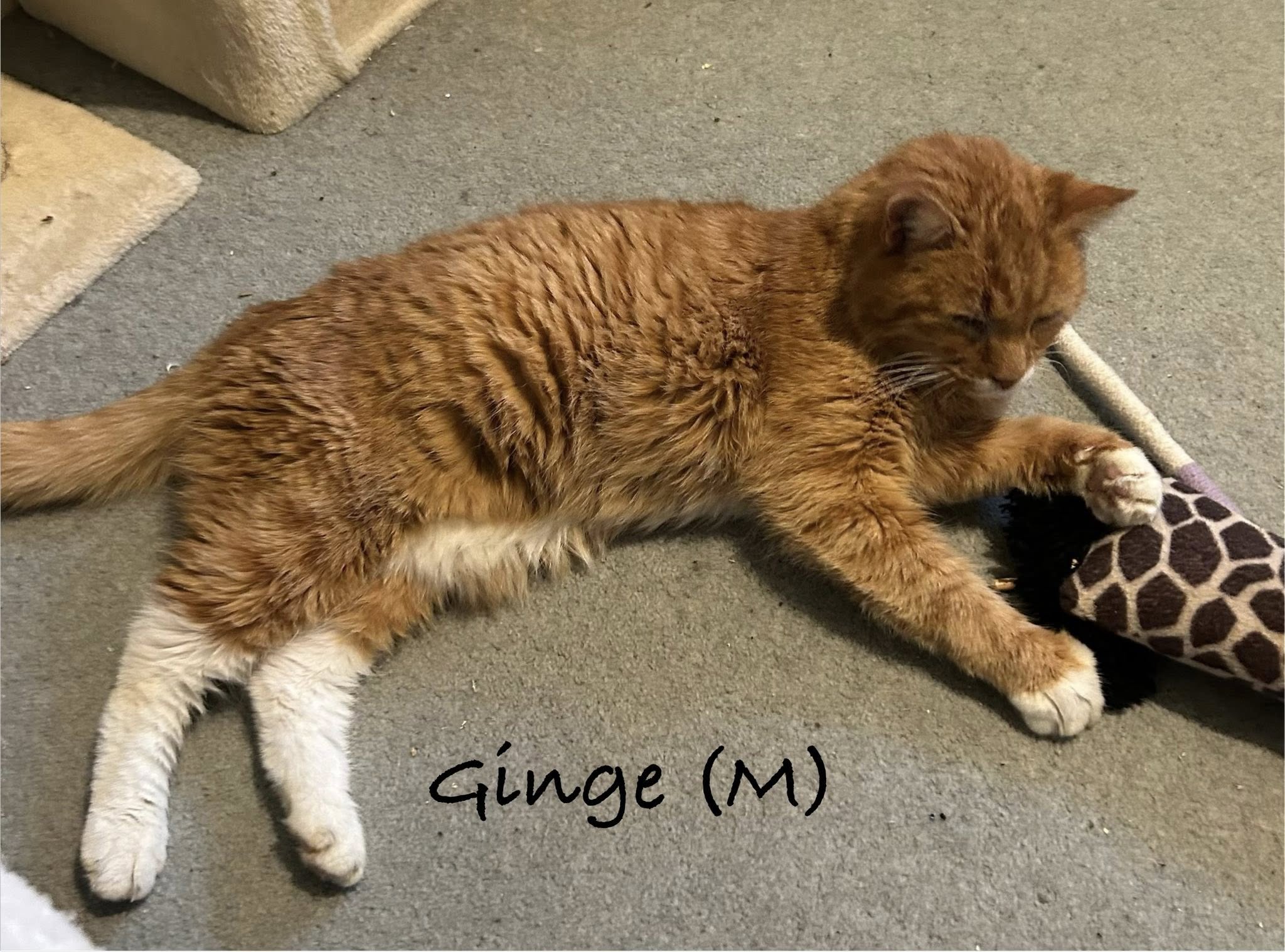 Ginge is estimated to be about 8years old and came into Rescue on 9th Jan having been straying for several months previously. He was neutered, wasn’t microchipped and not wearing a collar and despite the finder asking around the local area and posting on local social media sites no-one came forward to claim him. At some point in his earlier life he’s had a full dental extraction so he must have been cared for and loved especially as it didn’t take him long to settle in.