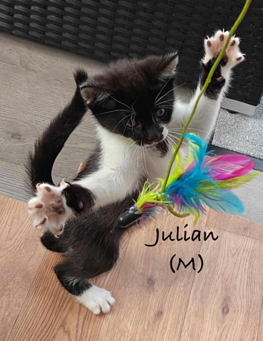 Julian is a typical mischievous, energetic and playful kitten who loves playing with balls, catnip toys and a laser pen. Julian is a very loving boy who wants to be with his human all the time & will follow you around and likes to groom you and cuddle up to you to sleep. He also loves watching the TV.