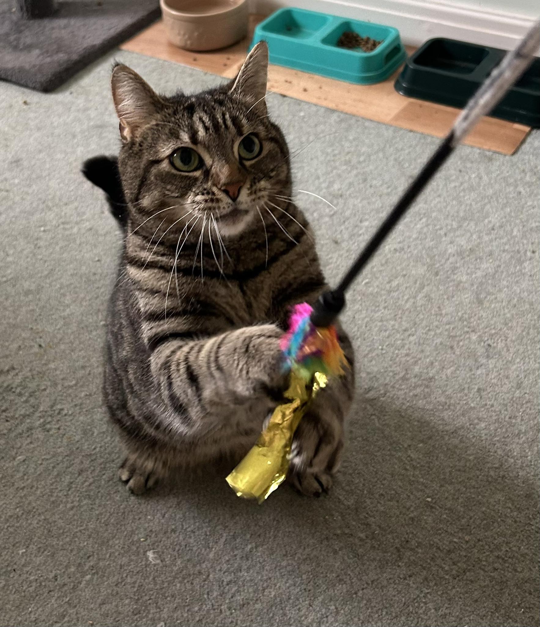 She is a playful lady who loves playing with toys on a stick, catnip toys or balls in a track.
